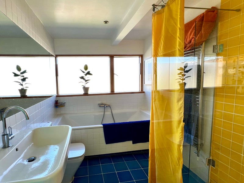 It’s a great room, it has wooden floors and large windows overlooking the garden and it’s furnished with a new double bed and mattress, a desk, chest of drawers and a built in wardrobe with lots of storage space. It’s quiet, with blackout blinds, but very sunny and light during the day.