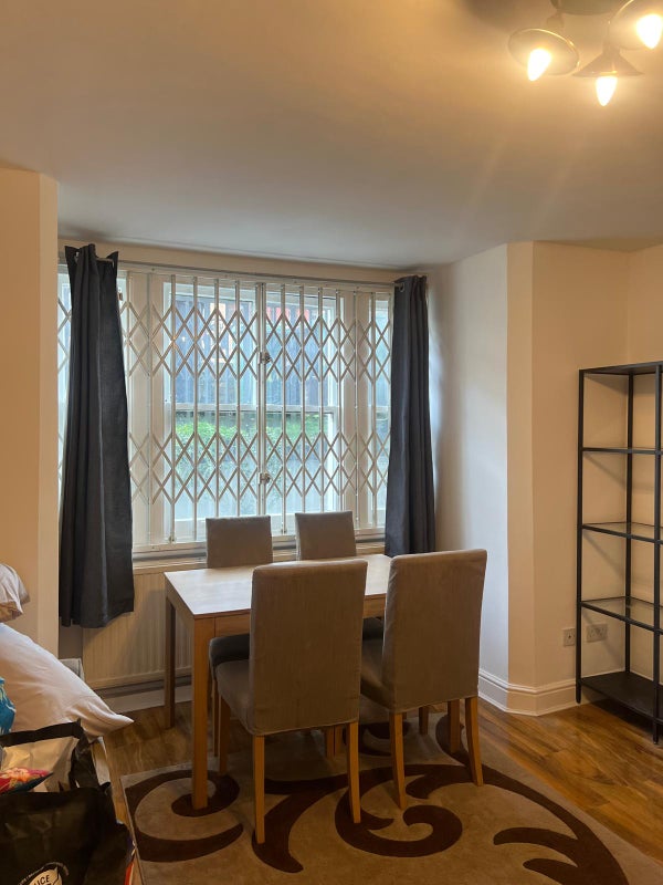 The living room is right off of the kitchen and has a big window to let in natural light (and curtains when you want more privacy), and includes a dining table that opens up to seat up to 10 people, a comfy couch to relax on, and space for you to put up a bookcase, storage, or that great sculpture you made a few years ago and just didn't have the space to display. Considering you're only a couple of minutes from Kilburn High Road, it's very quiet inside, which is great if you work from home sometimes, as I do.