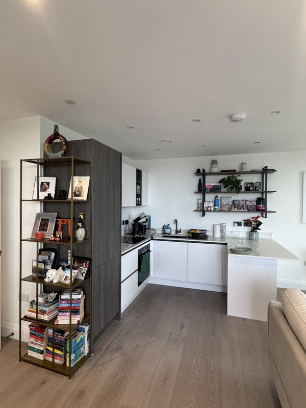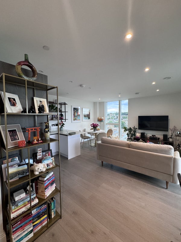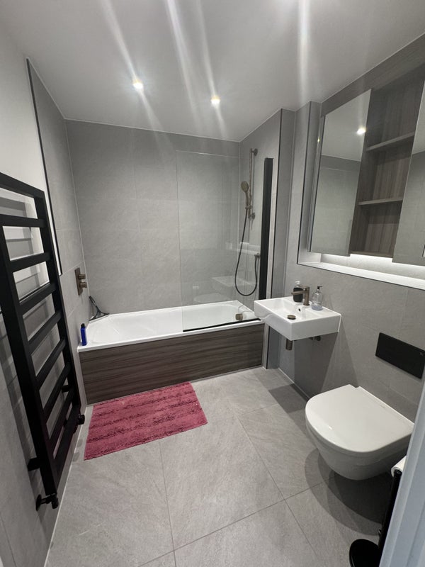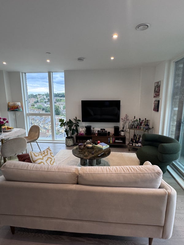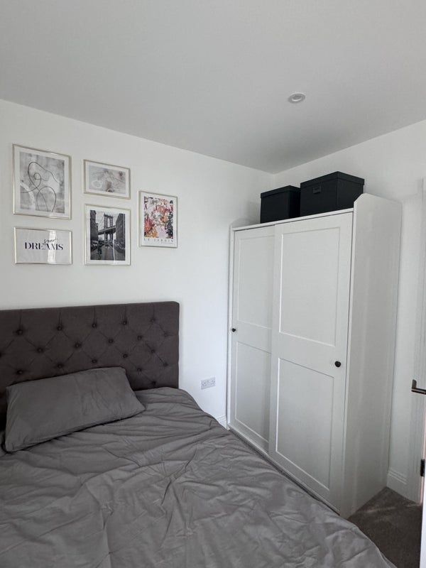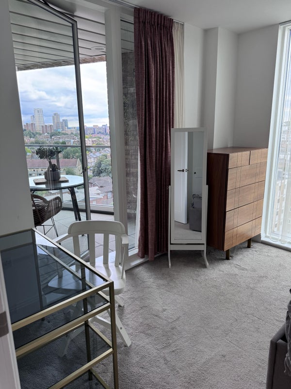 I am renting out a modern, newly furbished double room in a new build (the building is only 2.5 years old). The room has a new bed and mattress, wardrobe, big chest of drawers, desk, chair and a bedside table and lamp. There is additional storage under the bed. It has direct access to the balcony and there is generally a lot of light in the room. The flat has 2 bedrooms and 2 bathrooms, so you would get the master bathroom for your exclusive use. The building is just a 2 min walk from Greenwich DLR station. There is a PureGym just outside the building and both a Waitrose and a Sainsburys & Aldi 7-8 min walk away. The flat has a balcony and a very modernly furbished lounge and kitchen.