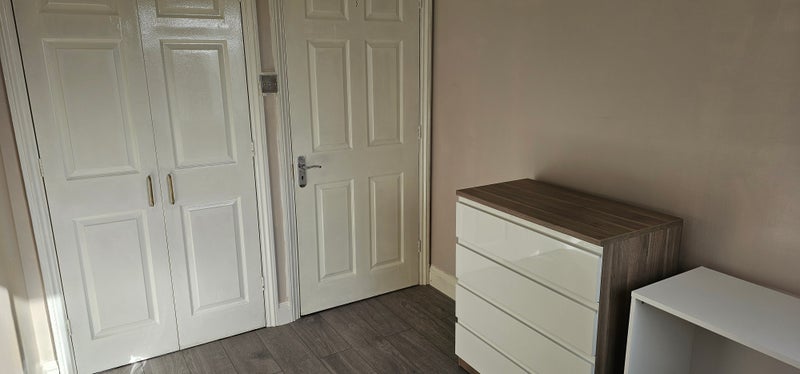 The room is located on the second floor. This room has a cosy bed, a desk, a chest of drawers, and door hangers. It has a fitted cupboard for storage.