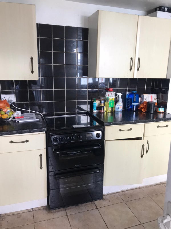 Cooker, Washing machine and Dryer with access to fridge and cupboards.
