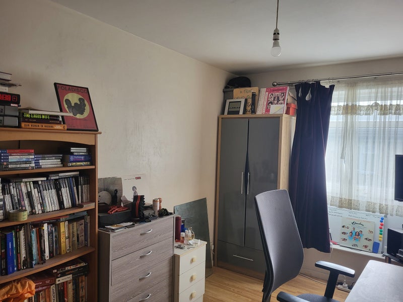 A double bedroom in a house with a garden. There are three bedrooms upstairs, including the one for rent (and a box room that stays unoccupied) and one downstairs. The room is currently furnished but we can also provide it unfurnished.