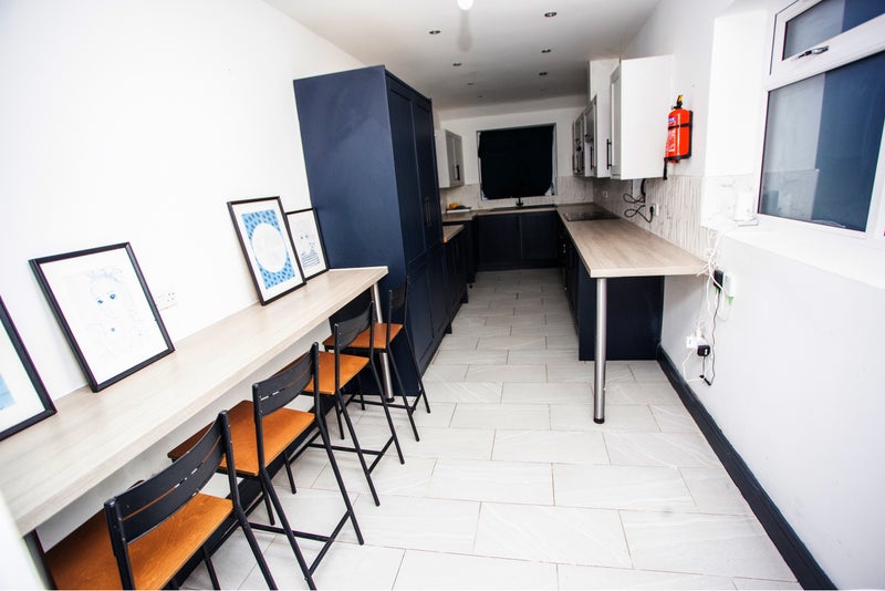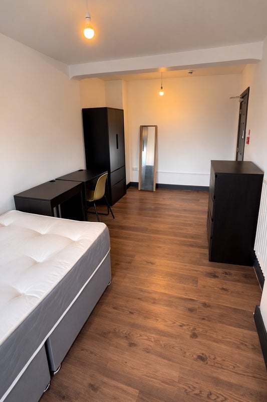 The room includes a comfortable double bed, large wardrobe, chest of drawers, mirror, desk and chair, providing both excellent storage and a dedicated workspace for those working or studying from home. The large layout means there is still plenty of room to move around and make the space your own.
