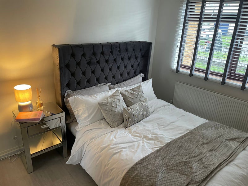 A freshly refurbished 2-bed with a sleek grey and white theme. Ground floor with free parking and a spacious shared living area perfect for relaxing or working remotely.