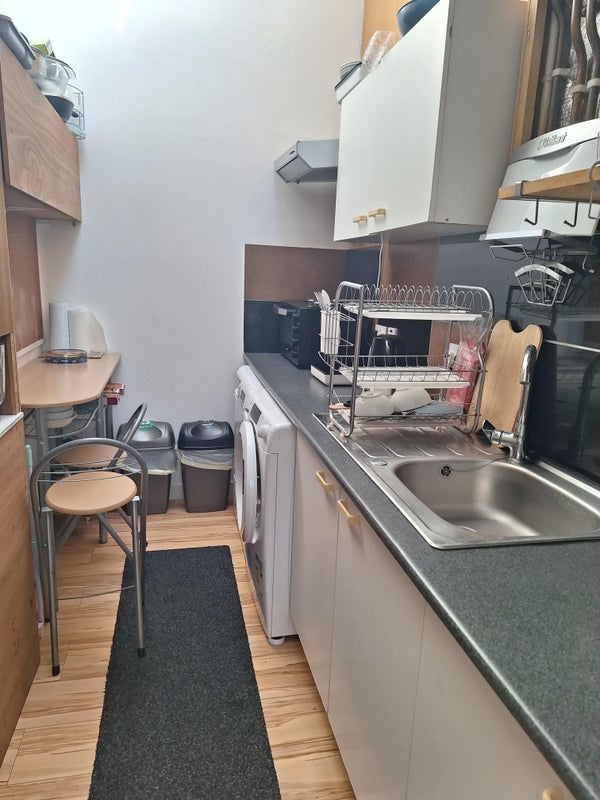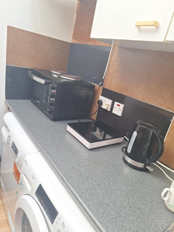 -1 kitchenette with a small oven with 2 hobs, induction hob, kettel, microwave & fridge freezer, tsble & 2 bar stools, TV;