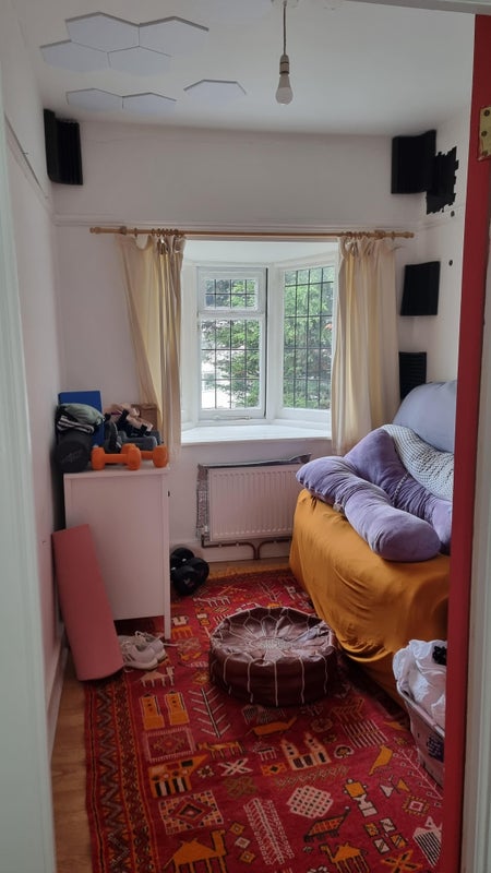 The room is unfurnished so you can make it your own. It has wooden flooring & a big bay window with loads of natural light. The room is currently used as a third living space/exercise space, you can keep the chest of drawers and/or use the sofa bed as a bed for the room if you wish, otherwise the room will be unfurnished and you are able to bring your own bed and the sofa bed will move into the living room for extra seating :)