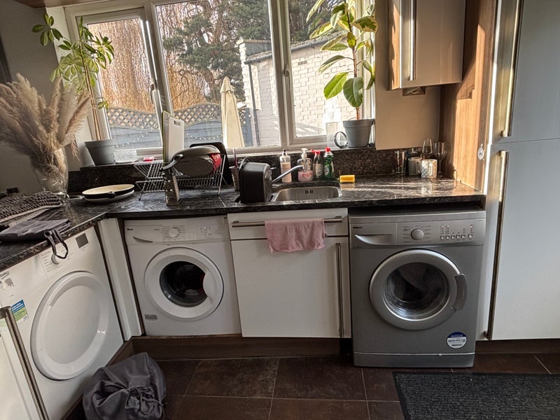 There is one bathroom and toilet on both the ground floor and first floor, separated for men and women. The kitchen and dining area are shared, but they are well equipped with a 5-burner induction hob, two large ovens, and plenty of storage, so even with many housemates, it’s very convenient. There are two washing machines and one dryer. Having two washing machines means no fighting over laundry time, and the dryer is very powerful, so you don’t need to hang clothes to dry 👍The landlord lives elsewhere but comes once a month to clean the shared areas, so you don’t need to clean the kitchen or bathrooms. You can use the washing machines and showers at any time of day.