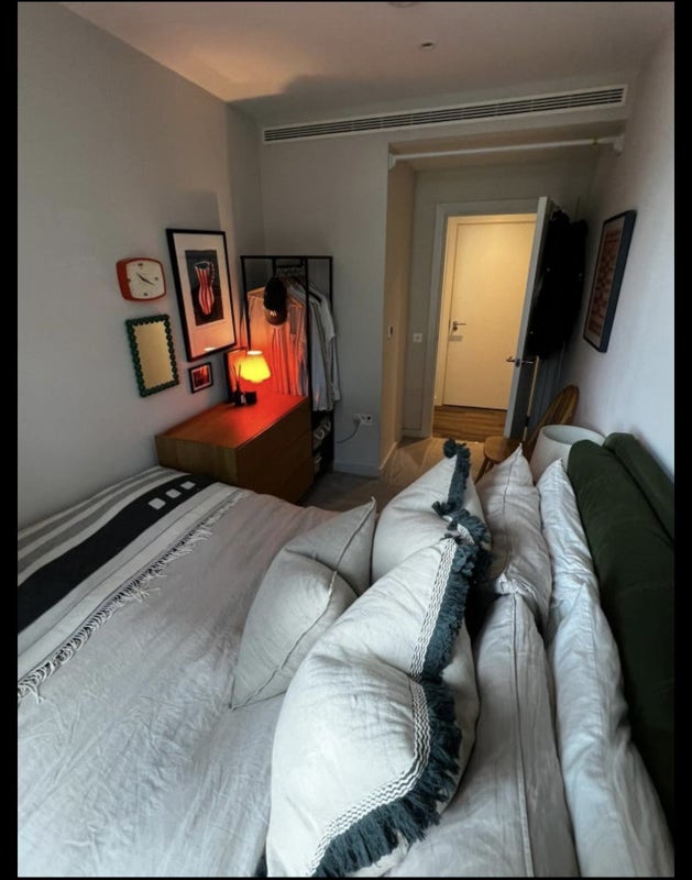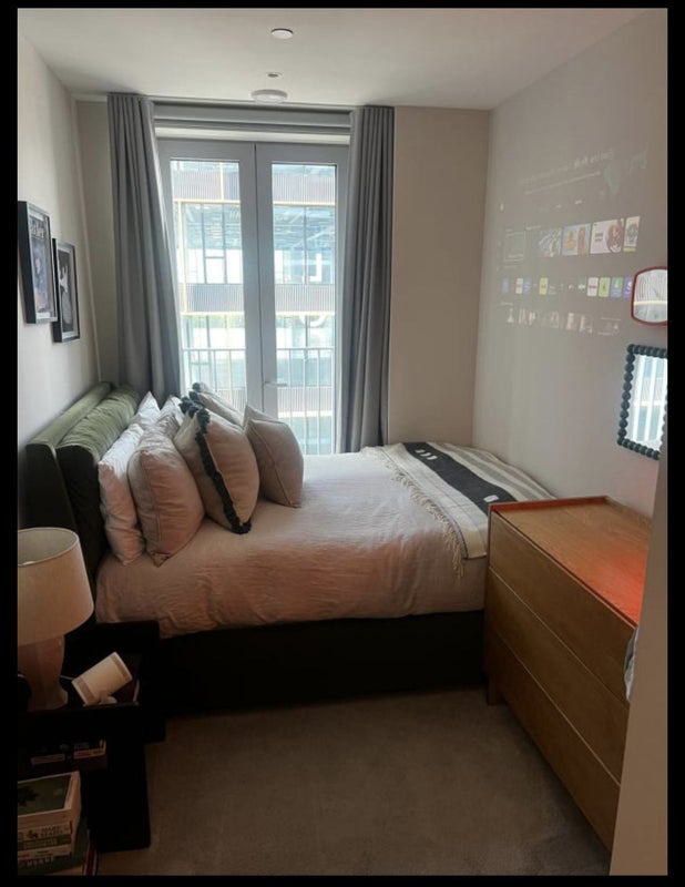 The flat: reasonable size. There is a rail in the room for clothes and chest of drawers. No wardrobe in the room itself but our previous house mate used the large wardrobe in the central wall of the flat for their things which worked well. As you can see in the photos the bed is up against the wall but it accommodated a 6 foot 4 lad which worked perfectly fine.