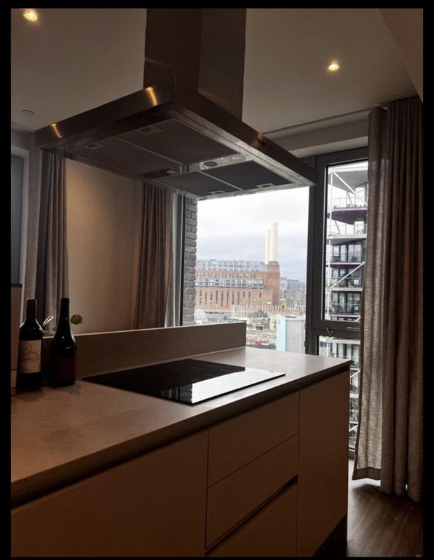 Bright en-suite room in a high-end 3-bed, 3-bath flat in Bloom West, overlooking Battersea Power Station and the Thames. The flat has a modern open-plan kitchen with Miele appliances, a lounge area, and a balcony with arguably the best view in the building.