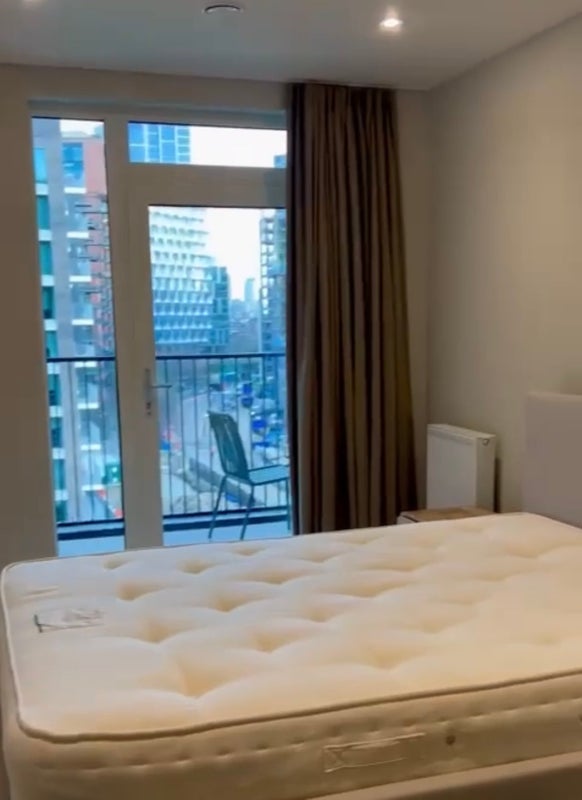 Double bedroom with own bathroom in a modern 2 bed, 2 bath furnished flat with a private balcony, near Embassy Gardens, Nine Elms.