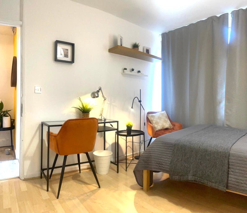 Monthly bills include water, electricity, gas, council tax, weekly cleaning service and high-speed broadband, all for £75 per month.