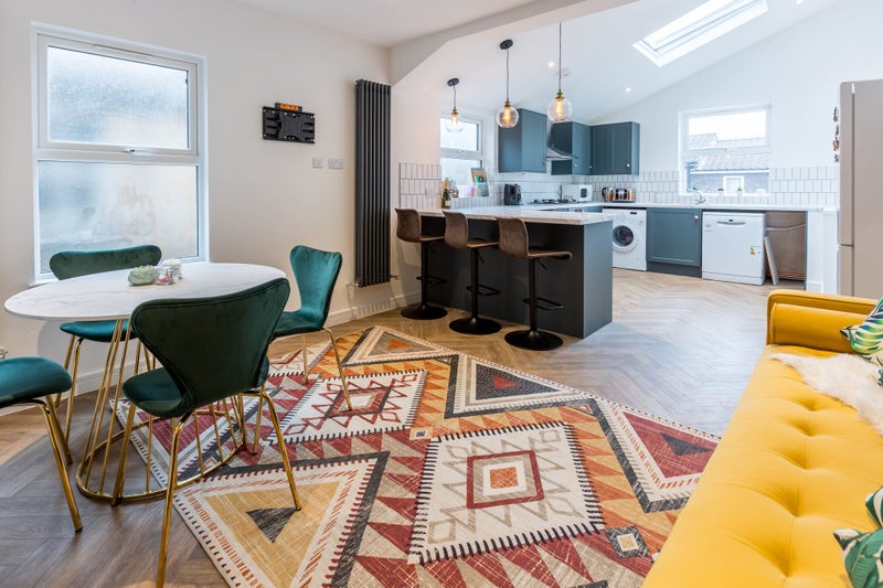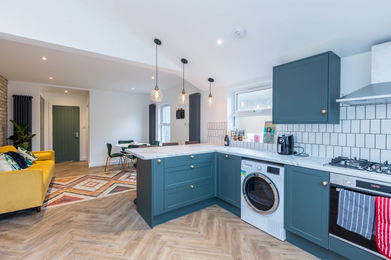 The large flat offers a spacious kitchen / lounge area and a sunny garden.