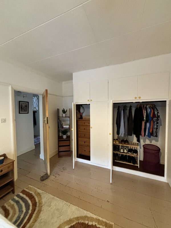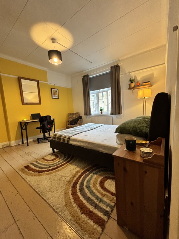 The room: Very big, 4.92x3.85m. More storage space than you’ll ever need. Comes furnished with a king-size bed and firm mattress, new blackout blinds, large chest of drawers, a lamp, bedside tables, rug, desk, and swivel chair. Situated at the back of the flat, so doesn’t get a lot of traffic noise. New USB sockets on both sides of the king-size bed.