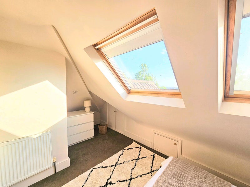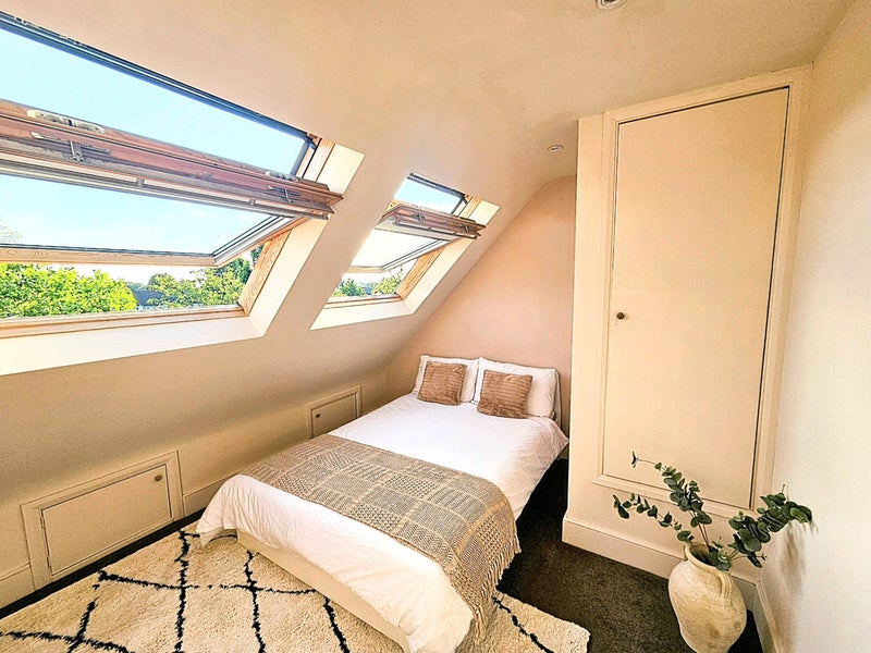 Bright and airy with bay windows, sofa, double bed, wardrobe and drawers