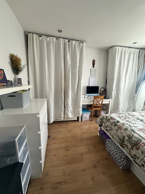 • Furnished: A bed, 2 built in wardrobes, 2 built-in drawers. My chest of drawers & desk will be moving with me.