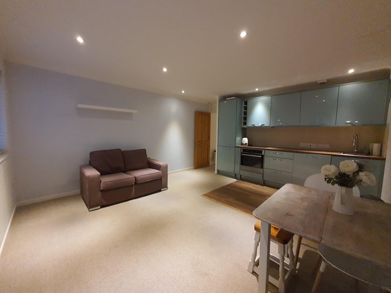 Bright open-plan lounge with a fully fitted modern kitchen