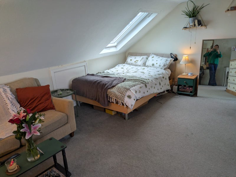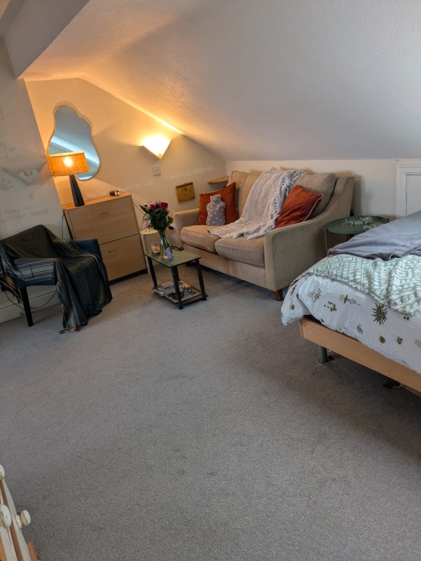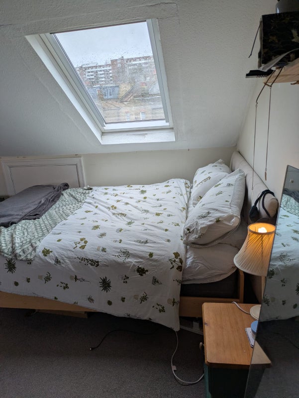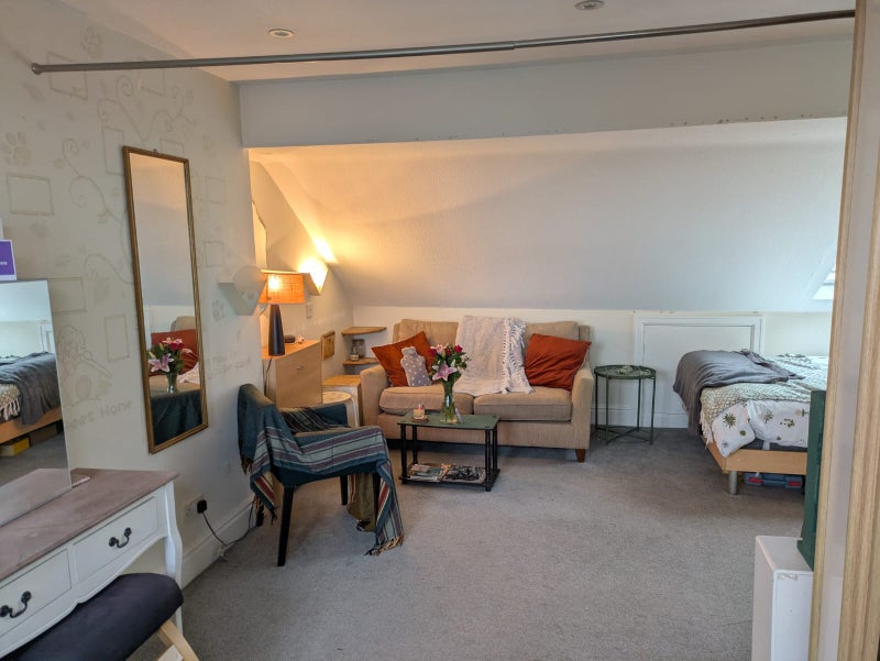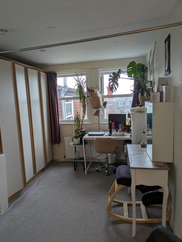 An L-shaped room, it's approx 20ft wide at its widest and 20ft long at its longest. Views to both the front and back of the house. There is space for a homeworking area, small living area and sleeping area. Large shared bathroom (one of two shared bathrooms) right outside the room, very convenient. Very private and quiet. Viewing highly advised.