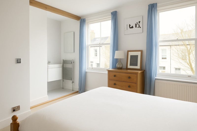 There are 2 large double glazed windows with wooden blinds as well as blackout blinds and views of the cherry blossoms when they’re in bloom.