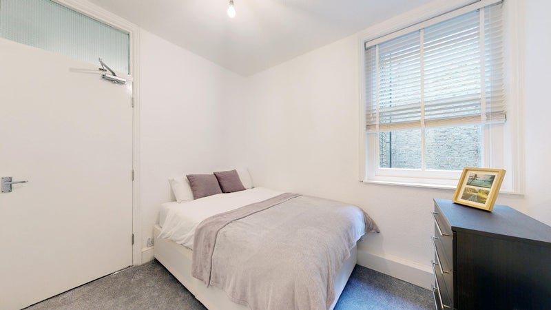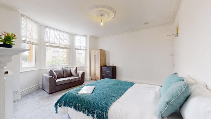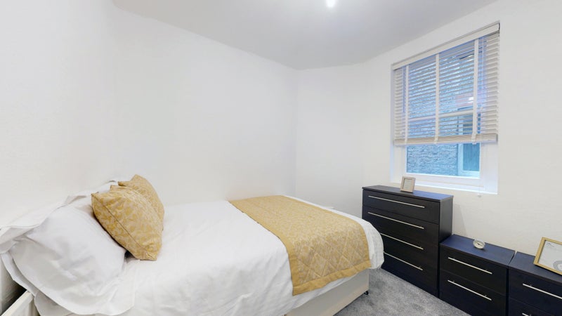 The flat comprises three double bedrooms, with the main bedroom featuring a double bed, bedside tables, and ample storage space. The additional two bedrooms also come furnished with double beds and plenty of storage. The family bathroom includes a shower over the bath.