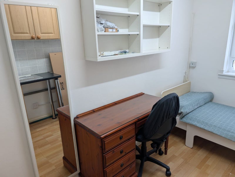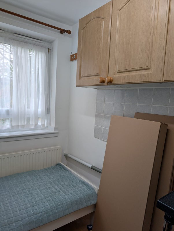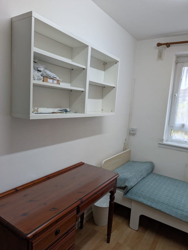 As the bed is shorter than a full length single the room would best suit someone shorter than 5'5" who would be able to stretch out fully on it. As well as the overhanging cupboards, there will also be a wardrobe suitable for hanging clothes where the Ikea box currently stands.