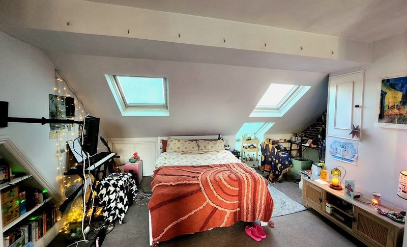 Room 3 - The best till last! This is a very large en-suite double. It is on the top floor, and feels nice and quiet, almost disconnected from the rest of the house. The en-suite bathroom has a shower over the bath and a small balcony. Its very bright and spacious with plenty of natural light and amazing storage throughout the room. The bed and desk plus desk chair is staying.