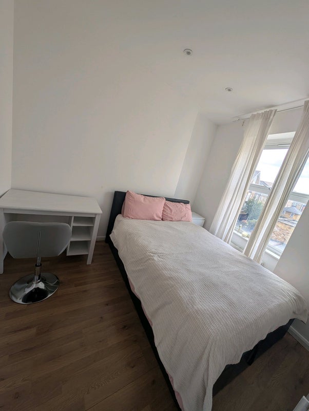 The available room is bright and airy, offering ample storage space and a comfortable environment to unwind after a busy day. A white desk and chair are also available if needed.