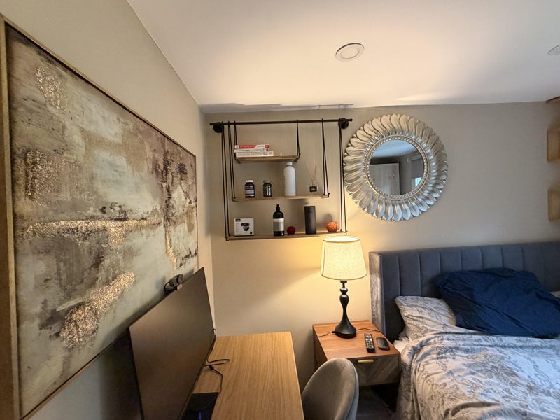 The flat is modern and comfortably furnished with high spec amenities and everything you would need, and a beautiful garden with roof terrace which this bedroom has access to. The bedroom is accessible by a staircase away from the rest of the apartment so feels private.