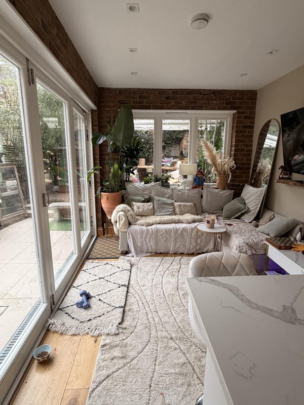 The flat is quiet and spacious, filled with light even on a rainy day.