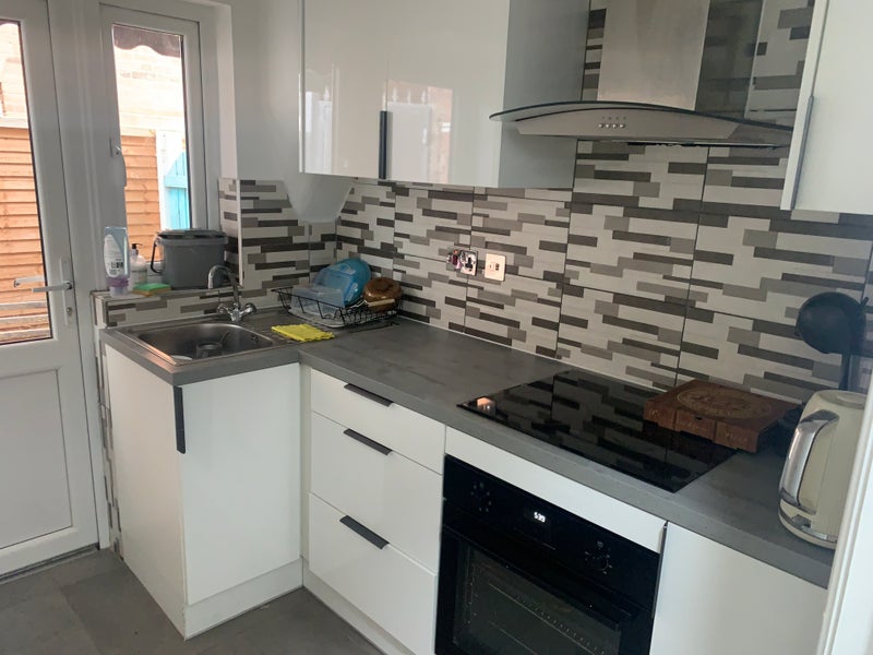 The kitchen is shared with other tenants, and everyone has their own separate fridge. There is also a small outdoor area / patio accessible from the kitchen.