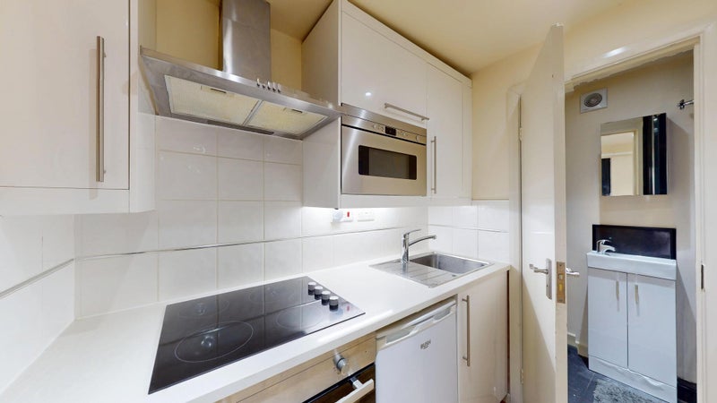 Available now. This studio is offered furnished, and the kitchenette includes a fridge, hob, oven, microwave and storage.
