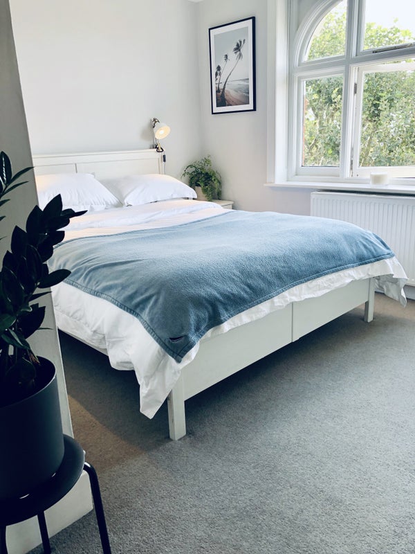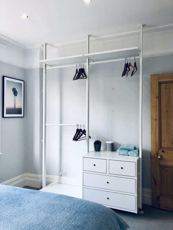 The double room is light and airy, north facing with a street view. Includes a king-size bed, ample open wardrobe space with drawers and its own separate bathroom/shower/toilet. The room is offered part furnished.