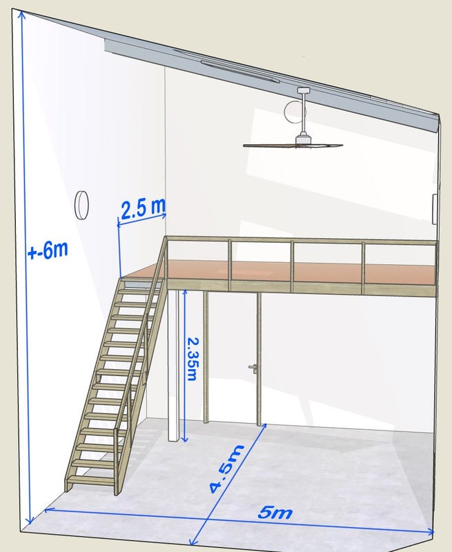The space is 365 ft² in total. With a total floor space of 242 ft² + a 125 ft² mezzanine. Very high ceilings. Two skylight panels and 2 v-luxes let a lot of natural light in.