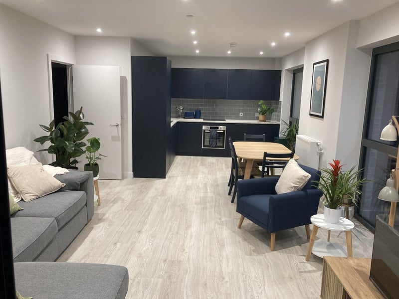 - 1,150 sq ft, three bedroom flat with a large living room-kitchen.