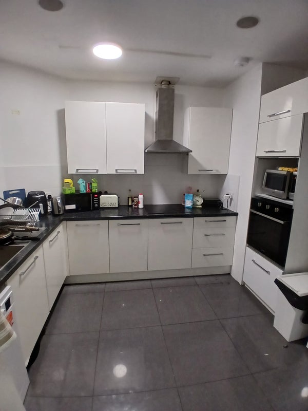 The flat itself is well equipped, with a spacious kitchen featuring a dishwasher, oven, stove, two microwaves, two fridges, and two freezers. There’s a shared bathroom with a rain shower, although two of the rooms have en-suites, so the main bathroom is not that heavily used.