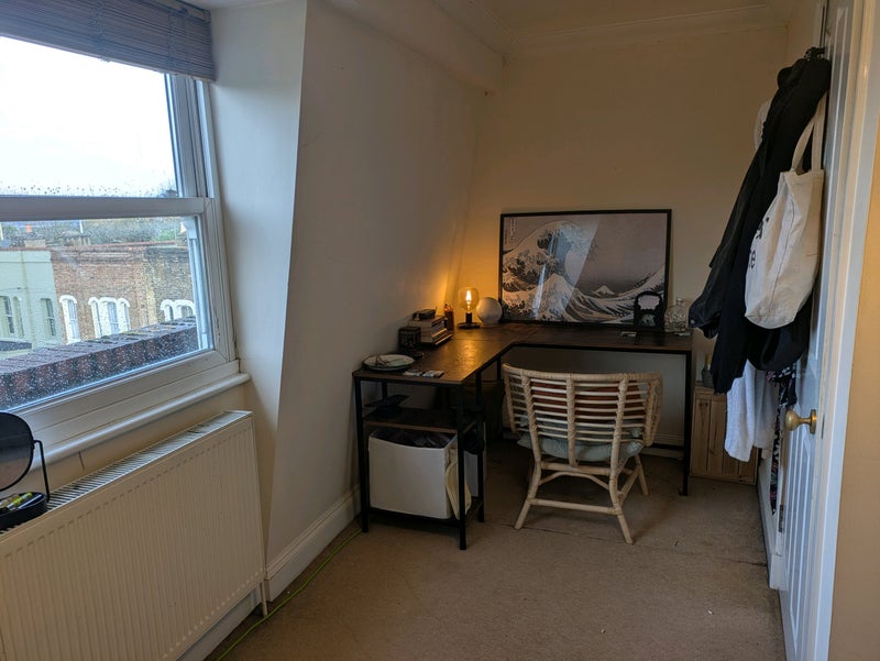 Top floor room inarge shared house in Bow, moving in with 5 others, 3 males and 2 females with ranges of professions. Age ranges from late 20s to mid 30s.