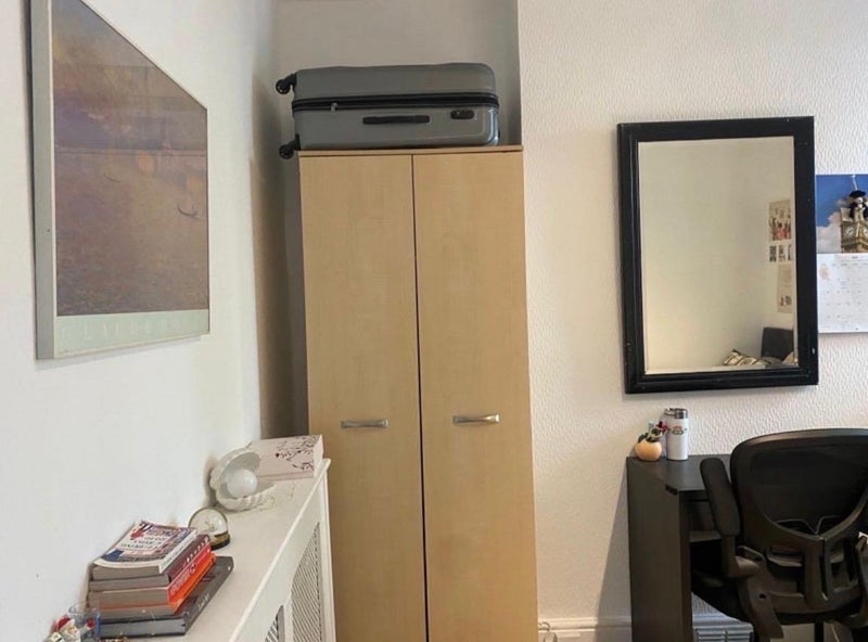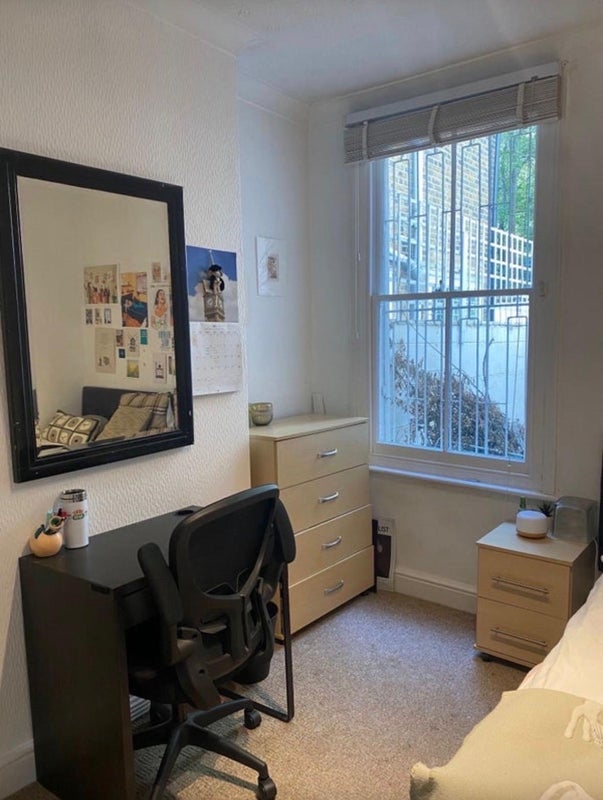 The room is on the ground floor and comes fully furnished (wardrobe, dresser, desk, chair, double bed, bedside table). You’ll be sharing a bathroom with one other girl.