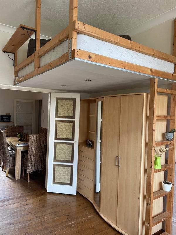 The living room and kitchen are connected and they are the heart of the flat. There is plenty of natural light and the rooms are cosy and spacious. The 3m high ceiling allowed my ex to build a 'hung' king size bed in the living room. Climbing up the vertical steps requires some level of fitness but it is a lovely comfy bed.