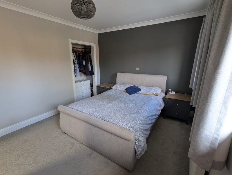 • Built-in wardrobe and additional storage units (drawers, tall cabinet, bedside tables)