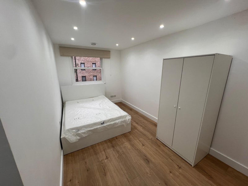 The highlight of this home is a spacious double bedroom located on the first floor, complete with a private ensuite bathroom. This bright and modern room features a brand-new double bed, a large white wardrobe for ample storage, and light wood laminate flooring that adds a contemporary touch. The crisp white walls and recessed ceiling lights create an airy ambiance, while a good-sized window allows natural light to flood the space.
