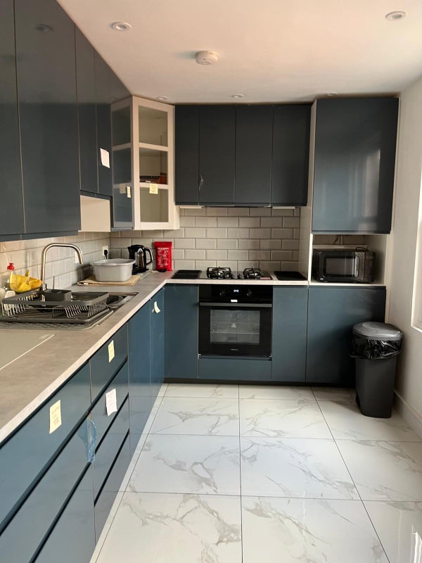 The shared kitchen is equally impressive, boasting glossy dark-blue cabinets and light grey worktops that provide a fresh contrast. Fully equipped with a built-in oven, gas hob, and integrated appliances, it is a practical space for culinary enthusiasts. The tidy layout and organised storage reflect a harmonious living environment, complemented by a cleaner provided for communal areas.