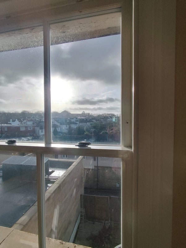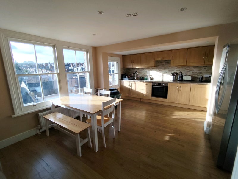 The flat is modern, bright and very comfortable. The kitchen is large, with a sofa area and lovely views towards Alexandra Palace. It’s fully equipped with an electric oven and hob, microwave, air fryer, toaster, kettle, cappuccino machine, a very large fridge, cupboard space, two washing machines and a tumble dryer.