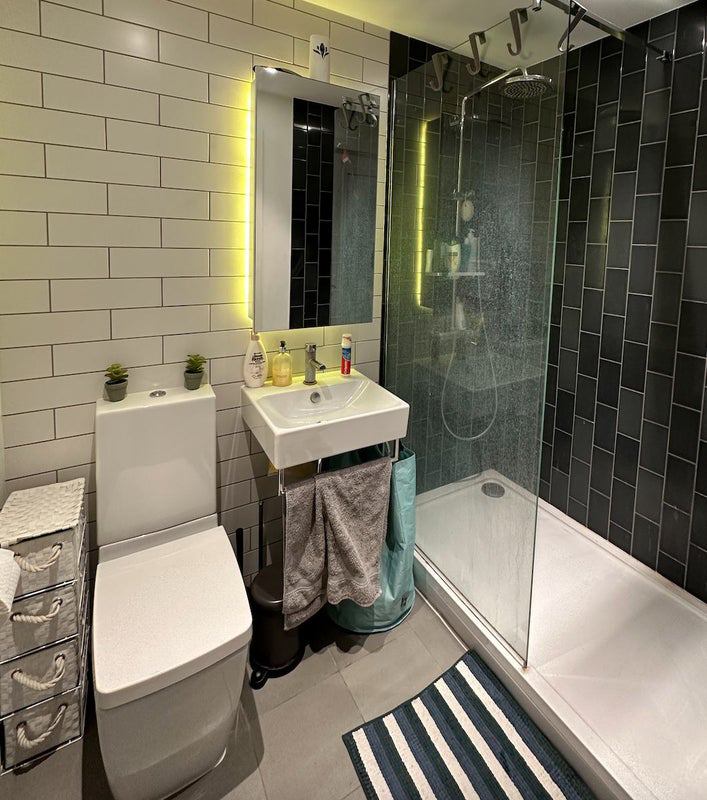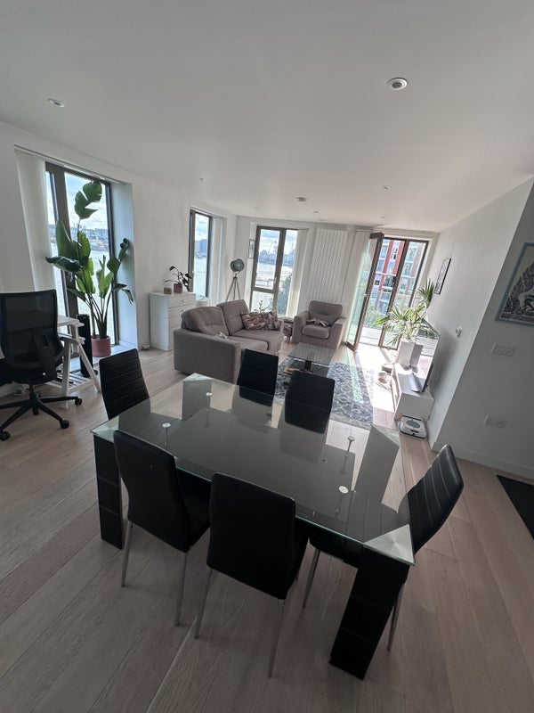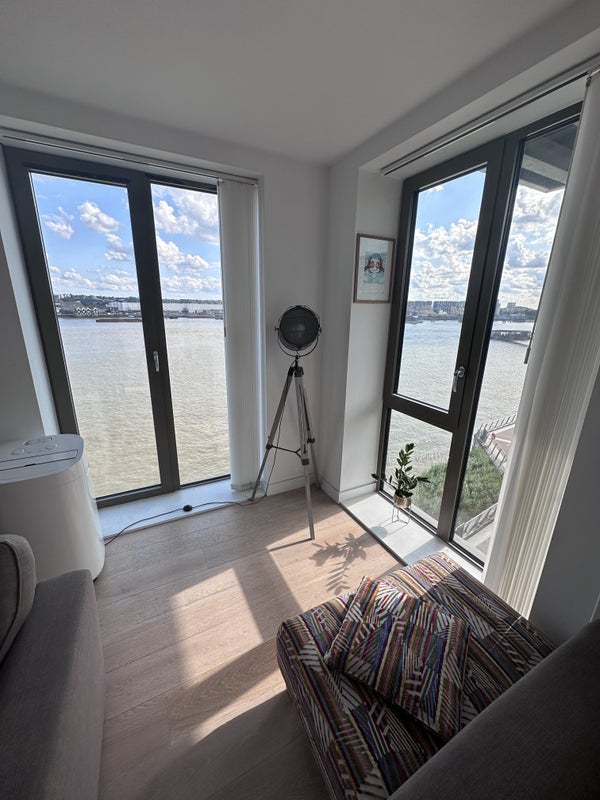 A fully furnished room with private bathroom - comes with a double bed, mattress, 2 bedside drawers, a 3 door wardrobe, and additional storage area. Extra storage wardrobes/utility cupboards in the flat (there is available storage space in the entrance and in the 3rd empty bedroom). The room has enough space to put a proper desk and chair for working from home. As said, there is a 3rd room which we can use as a laundry/storage/guest room. The flat comprises an open plan living area with 2 huge balconies with views of the river Thames (and Thames Barrier). The apartment has a modern kitchen with all appliances i. e. oven, dishwasher, washer-dryer. Large OLED TV in the living room, there's also an air purifier, portable AC unit for hot Summer days, vacuuming & mopping robots that will clean the entire flat for us... :)