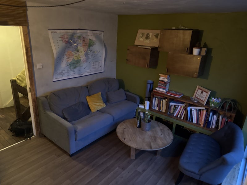 The room has a double bed, with three wardrobes, a chest drawer and the bathroom next to it. Shared living room bathroom and kitchen.
