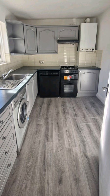 There is a brand new unused gas cooker and dishwasher in newly refurbished kitchen with fridge freezer and washing machine.