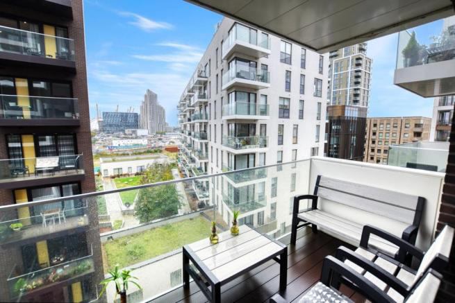 - Balcony includes two chairs and a table. With a view to the O2.