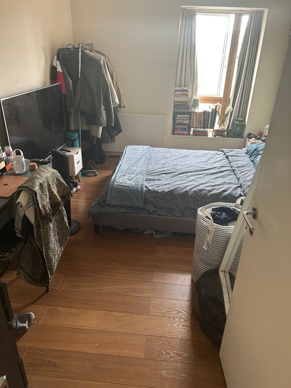 Spacious bedroom to rent in a 3 bedroom flat. The flat is on the third floor and faces the Thames, providing a bright and cozy place to stay.