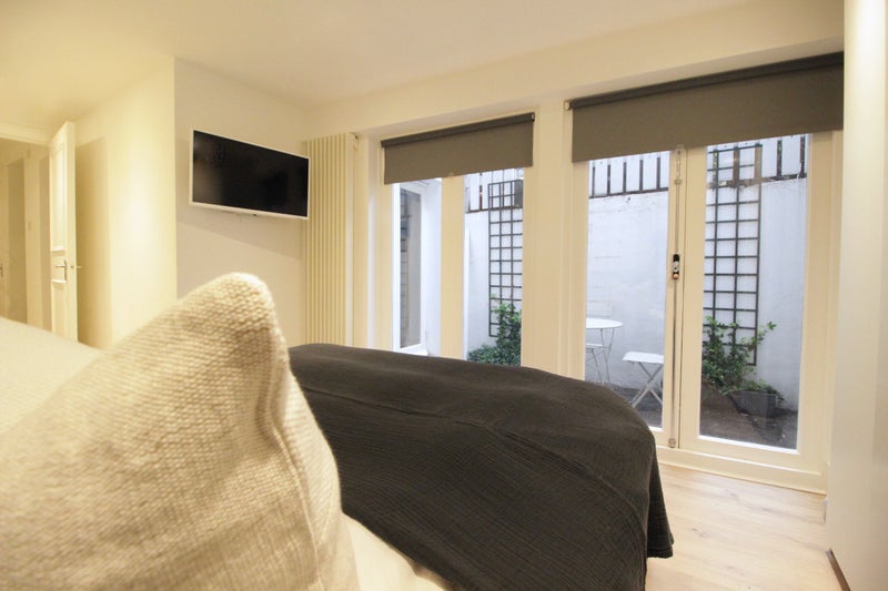 Your double bedroom offers direct access to a quiet courtyard and includes an en suite. The room also includes a double wardrobe with ample hanging space and a wall mounted 32 inch flat screen TV with Netflix and Sky Cinema.