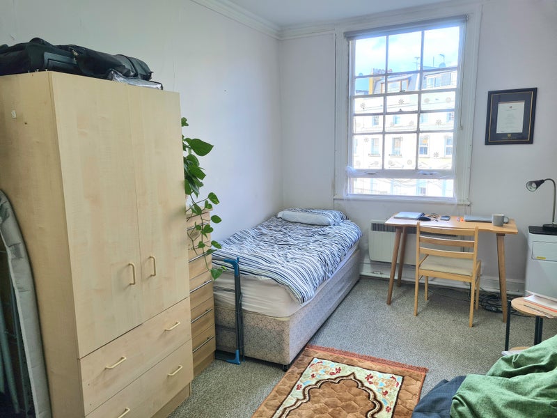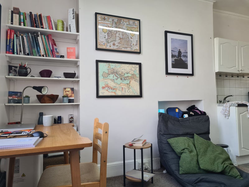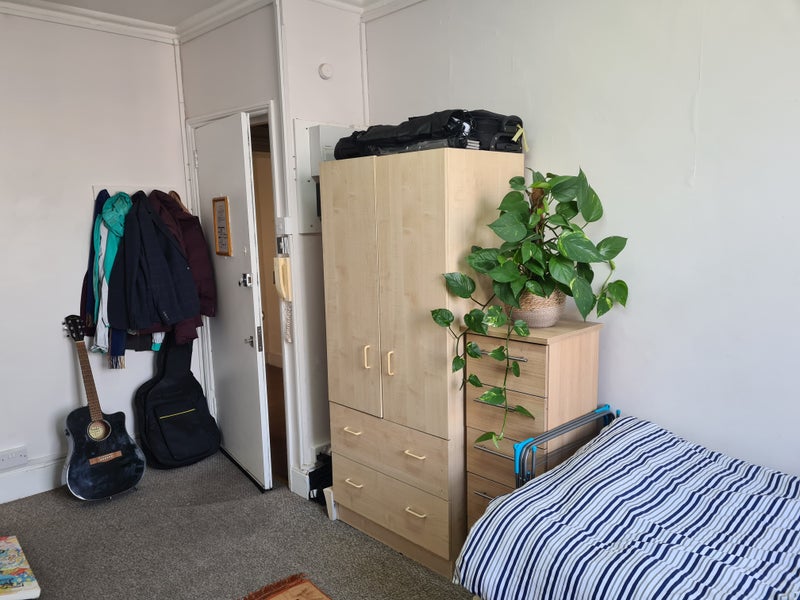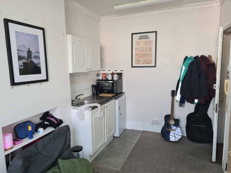 The flat is a single room with its own oven, hob, sink and fridge. It is fully furnished with a comfortable single bed, drawers, wardrobe, desk, chair, beanbag and multiple shelving units and cupboards.