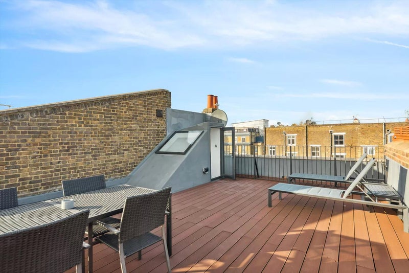 Comprising 2 double bedrooms, bathroom and a reception room with dining area, an open plan fitted kitchen and a large roof terrace.