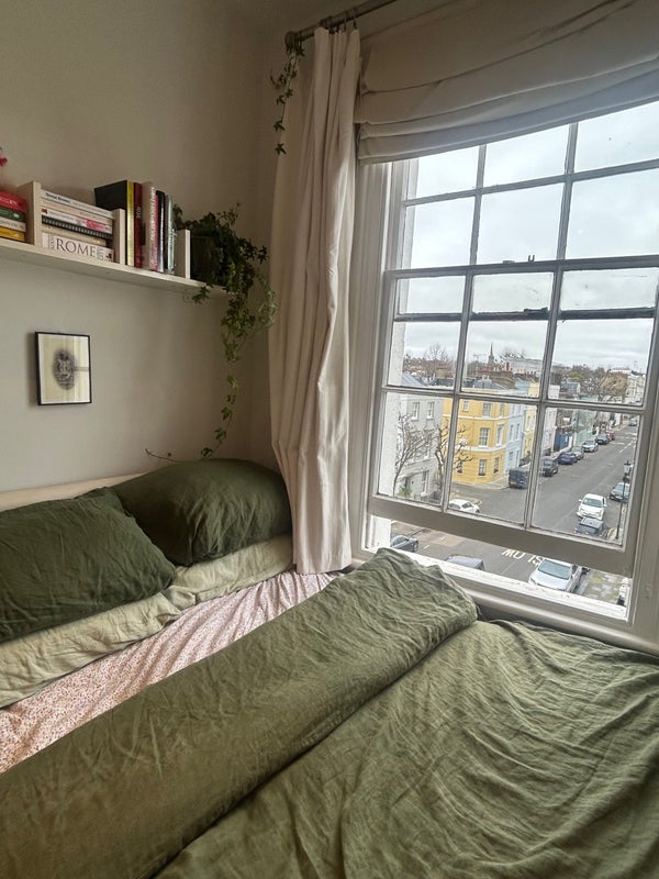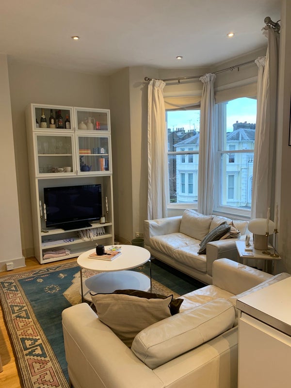 Located on the top floor of a Victorian terrace in Notting Hill, the flat has timber flooring throughout with a modern bathroom and kitchen as well as an airy, light-filled living and dining room. The flat has central heating and comes fully furnished (including crockery, cutlery, dishwasher, washer/dryer) with plenty of storage. You’ll be renting one of the two bedrooms in the apartment which is a double bedroom with a wardrobe, dresser and corner desk. The room has a really nice view of a quiet street with the pastel coloured houses of Notting Hill.
